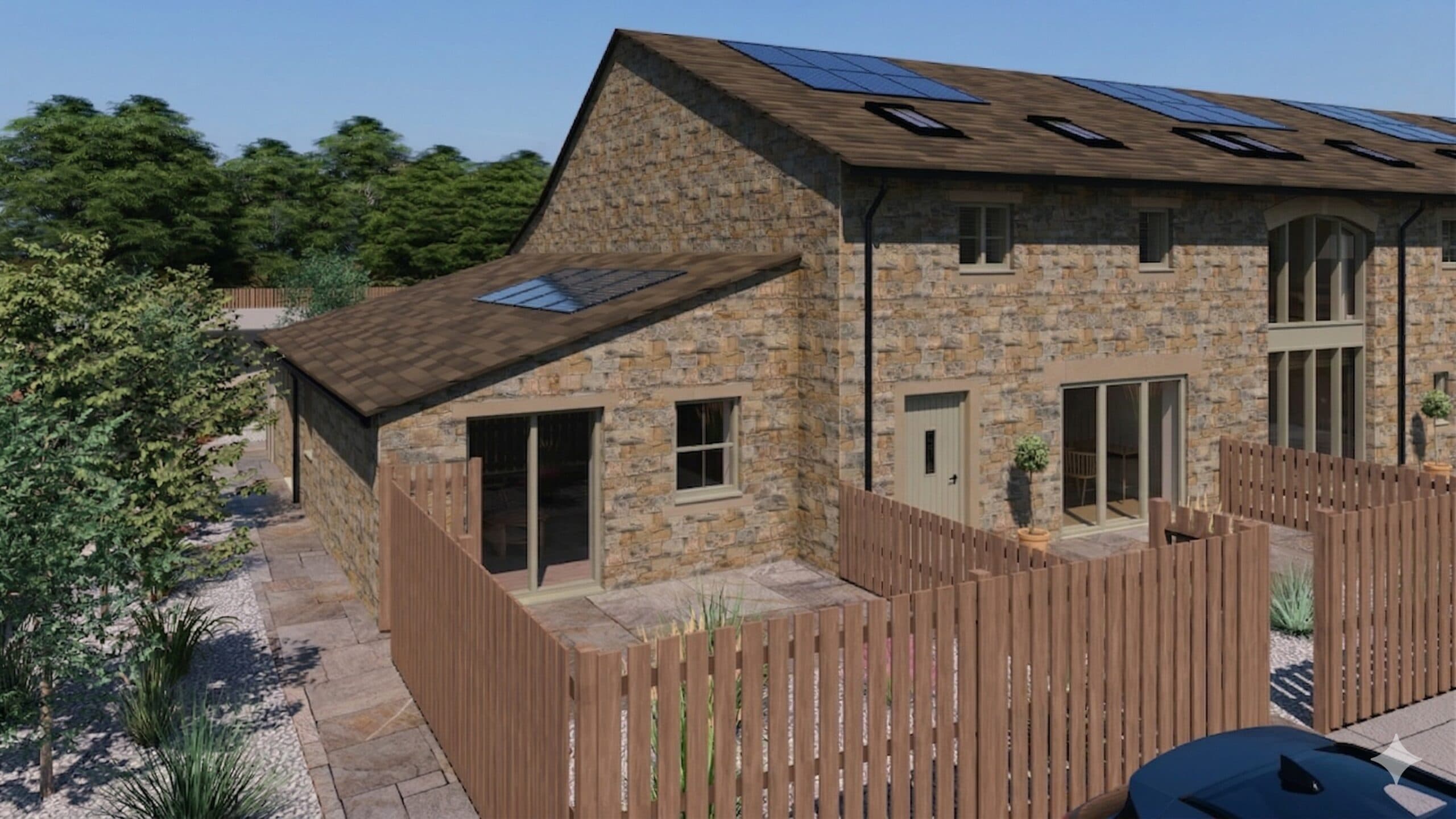 • A mix of natural stone finishes, including reclaimed stone to key elevations