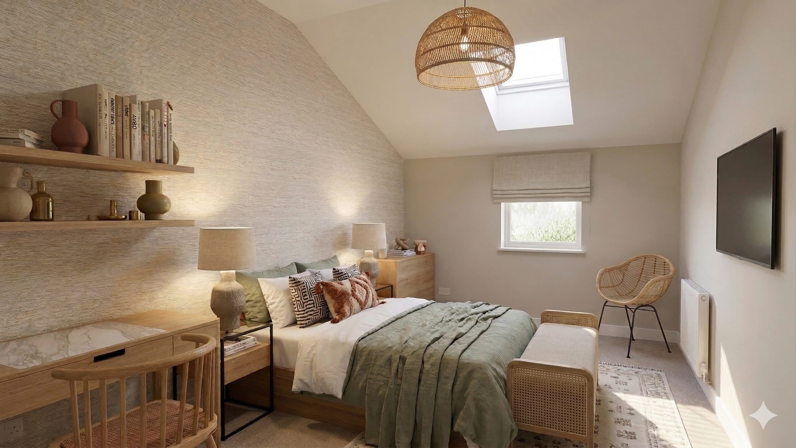 Vaulted ceilings feature within The Croft and The Laithe, creating light-filled living spaces, while the original roofline carries through to the upper floor, forming rooms with gentle slopes and individual character throughout the collection.