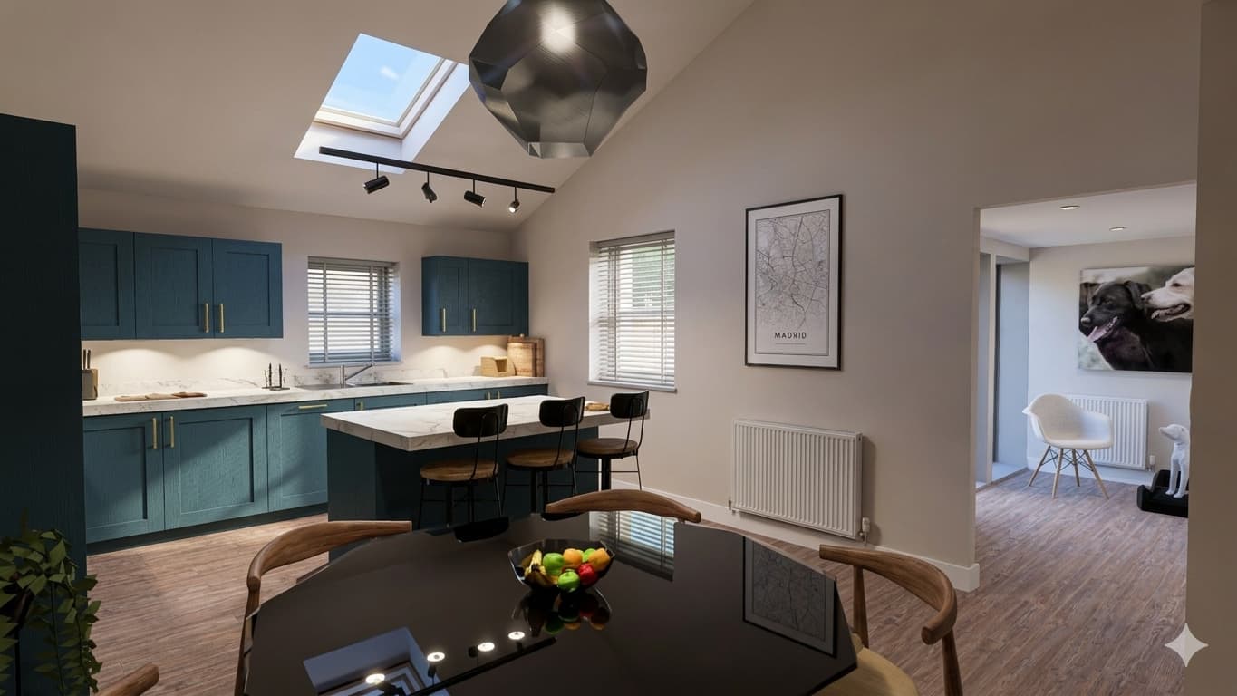 Quartz worktops, Belfast sinks and integrated appliances create spaces that feel both practical and considered. Pyrolytic ovens take care of themselves, a small detail, but one that makes everyday life that bit easier.